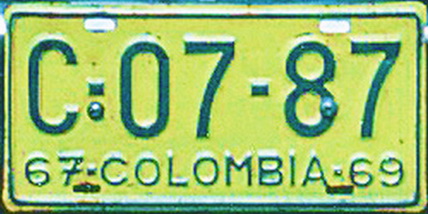 The only Colombian plate ever seen in Britain, I suggest. On an MGB in Kensington, London in 1968, with a 2-year validity plate (but no CO oval at the rear