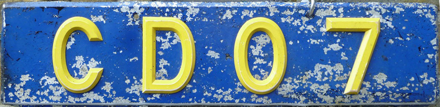 CD 07  —  Here is a true oddity.   Saint Christopher and Nevis is a Commonwealth Realm, whose sovereign is that of the United KIngdom.    I had not thought that such a status warranted diplomatic representation by foreign embassies and that The Federation of   ‘Kitts & Nevis’ might not even need embassies in such a tiny place.           However, Quentin produces this remarkable CD plate, showing salt-erosion evidence that it has been out and about there for quite a time.    Yellow on blue is the idiosyncratic colour-set for the West Indies CDs (though nowhere else) -= so that’s OK, – but why a leading zero, for goodness’ sake????     Only St. Kitts applies leading zeroes……    There could be some hot bidding for this Extremely Rare Plate…..     Thank you Quentin!       JULY 2015 – The plate never made it to Thierhaupten as planned, and was therefore not auctioned.    Held over until 2016……..