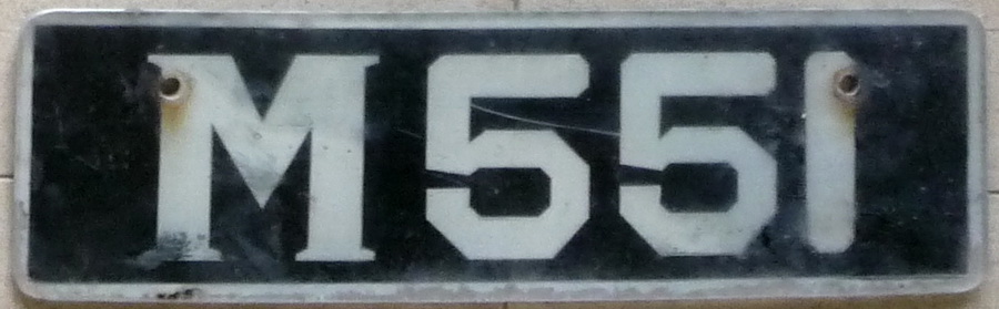 M 551  —  A delight to see this characteristic font, which applies only to Montserrat, where still, many/most plates are painted on any old piece of steel/alloy sheet. This was captured on Nevis, from a car which changed islands.