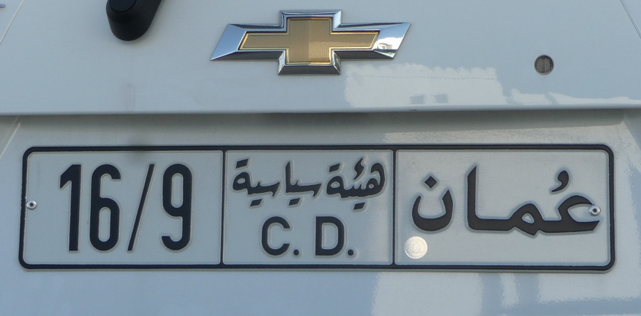 1/16 .. Oman Dip. plates have optional US or Euro dimensions, the differences seen here and below: 1 indicates an unknown embassy, favouring the 12×6-inch (?) yanqui measurements . Brumby archive 2014