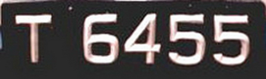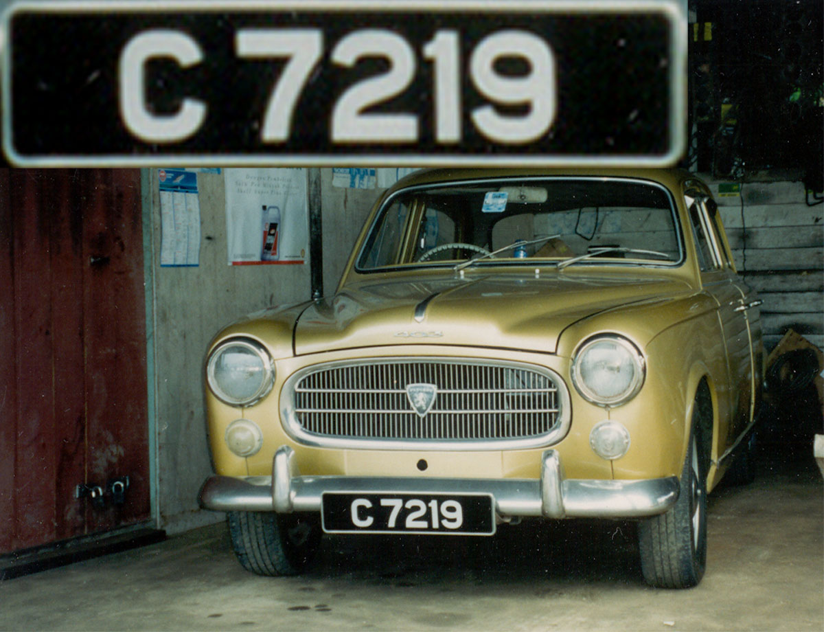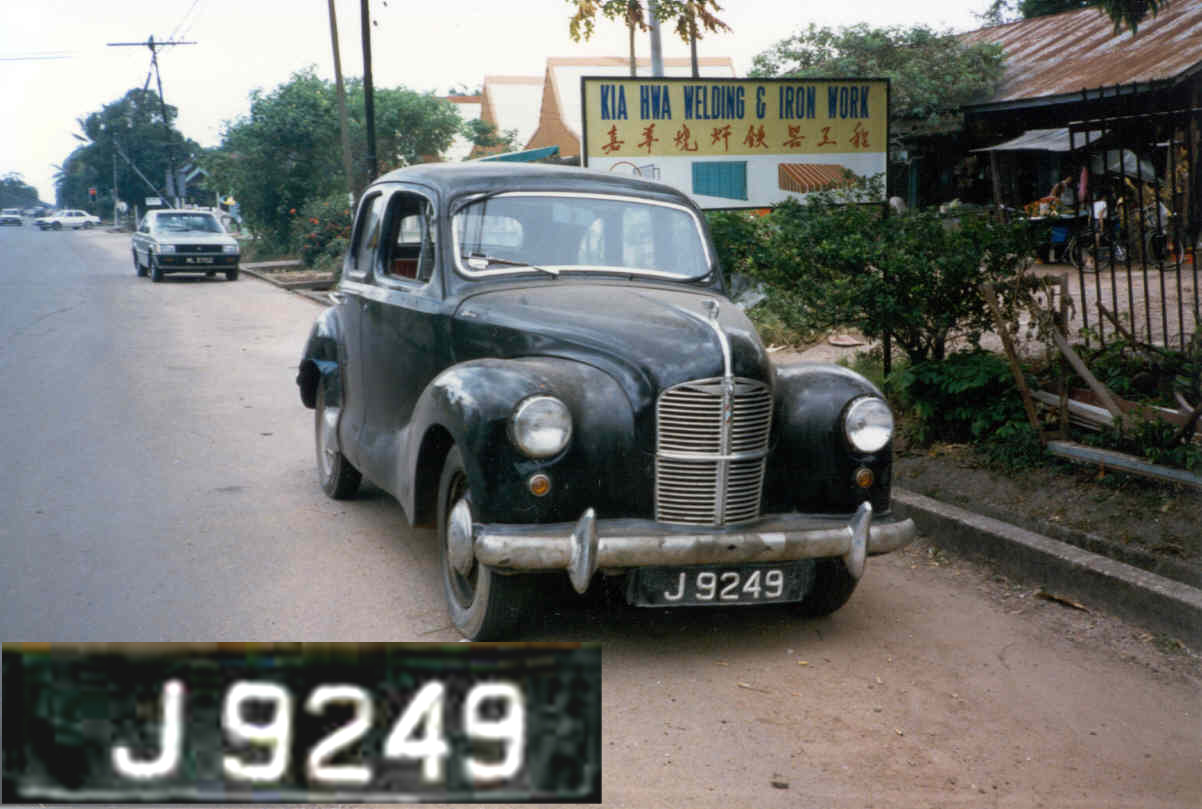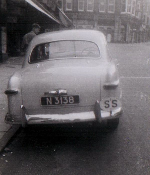 SS 9806. A plate from the former series. About 1960, many British Army, Navy and Air Force personnel served in Singapore and it was a period of very many new registrations, as most of them purchased a car there – (or duty-free at home, to take out and register there). This Austin A40 Farina belonged to a Wing-Commander, whose daughter June, modelling here, now dwells in Ottery St, Mary and makes jam for the Womens’ Institute. Brumby archive-June Harvey.