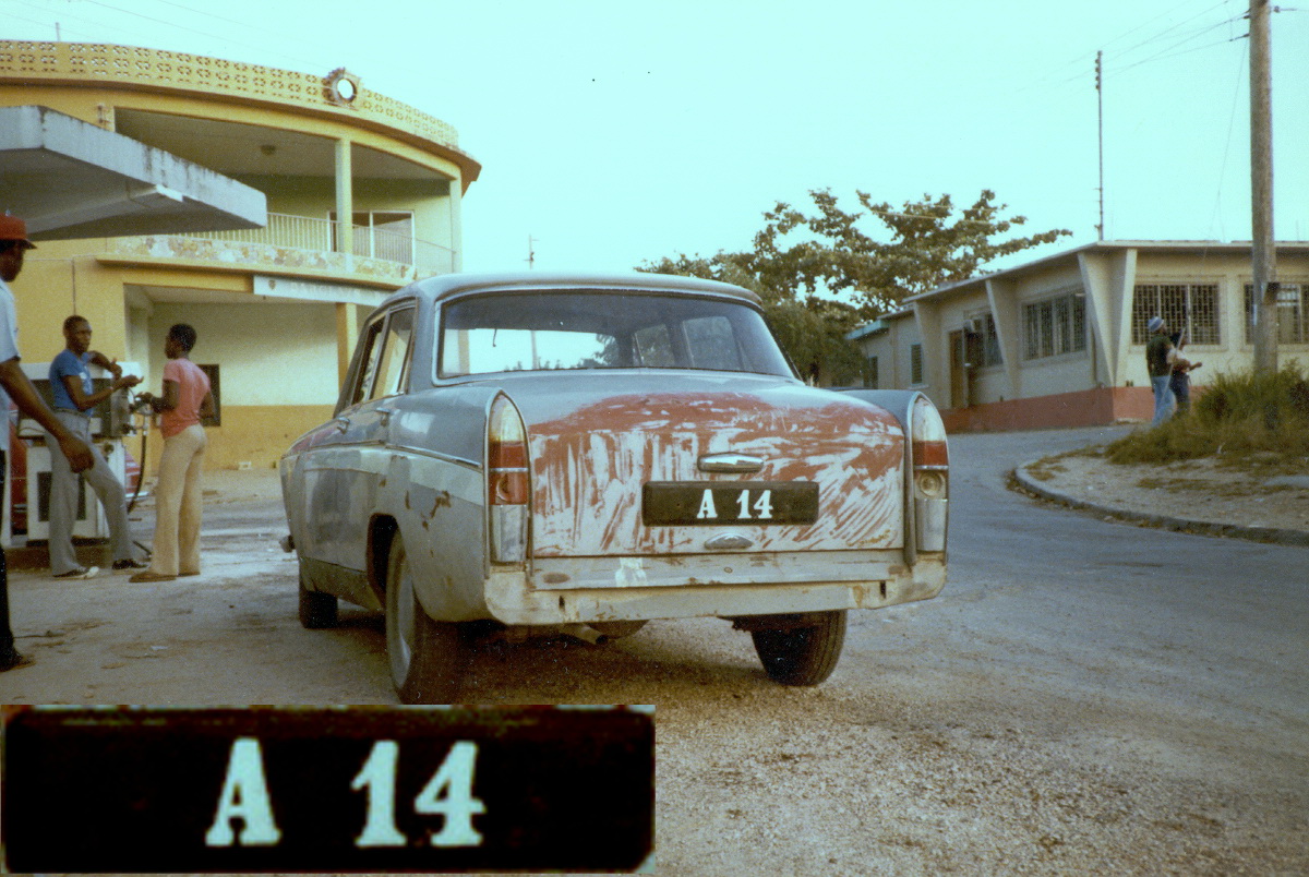 These BMC Farina Austins and Morrises were shipped all over the world and stood up well to tough conditions, often as taxis – as did the similar-looking  Peugeot 404s.    This one, A 14,  was approaching the end of its life at the petrol pump in The Valley, the main settlement, in 1981.   In 1980, Anguilla had seceded from its former uneasy union with St. Christopher, Nevis and Barbuda.        Brumby archive