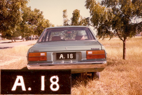 A.18, which would have first been issued in about 1935, is seen on a then-modern (1991) Japanese Datsun 120Y, indicating that Anguilla registrations were re-issued when voided.  See also A 14.  The ‘A’ series had reached the 1400s in Dec. 1981, though there was no evidence of so many vehicles.    Brumby archive