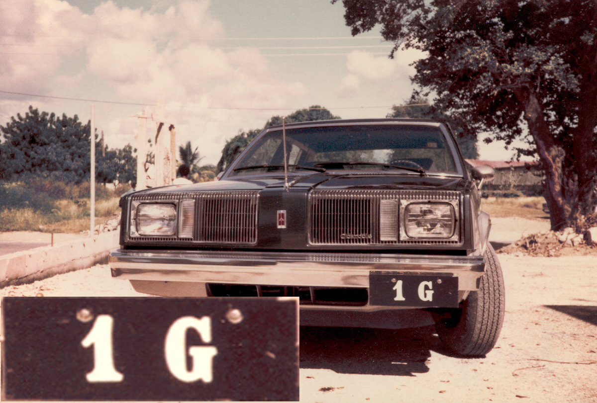 Odd though it seemed, this (wooden) plate 1 G on the islands’ smartest car, an  Oldsmobile, was attributed to the Governor when seen in 1981 in The Valley.  RPWO gives it that between 1980 and ’85, the authority on the island was vested in ‘Her Majesty’s Commissioner’  who bore the plate ‘HMC’.    As an aside, it was unknown for a British Resident to use a non-British car in those days – and this is a Left-hand-drive ‘foreign’ car selected for Right-hand-drive Anguilla – very odd….. Brumby archive